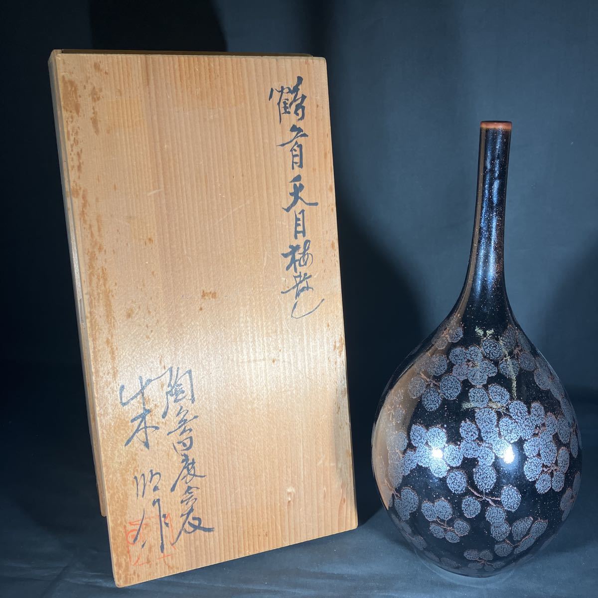 - 藤井朱明造 鶴首天目梅散らし 花瓶 八八八