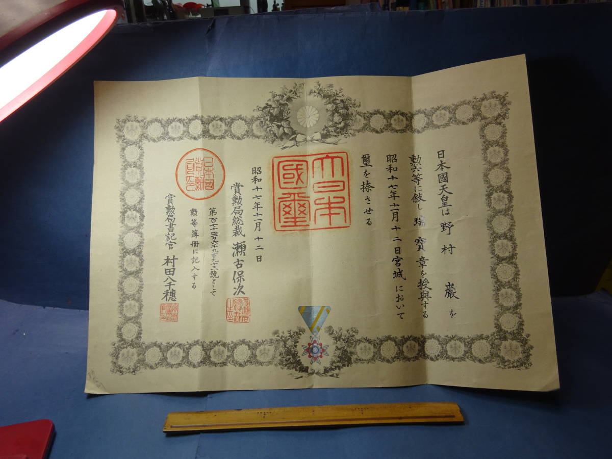 - (5)勲記 大日本国璽 勲六等瑞宝章授与証 昭和17年11月12日 於宮城