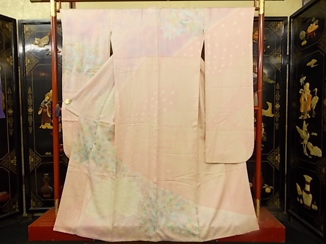 - きもの今昔4269 ふりそで 淡いピンク地孔雀の絞りと孔雀の色付けパール加工柄 わずかに汚れあります(画像⑧⑩)