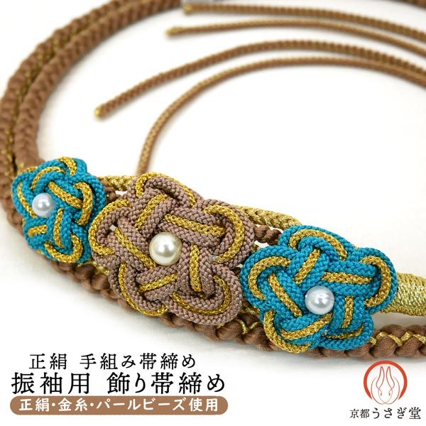 - 正絹 振袖用 飾り帯締め oj-001 白茶色 ライトブラウンくすみカラー 組みひも パールビーズ 帯締 帯締め 成人式 結婚式