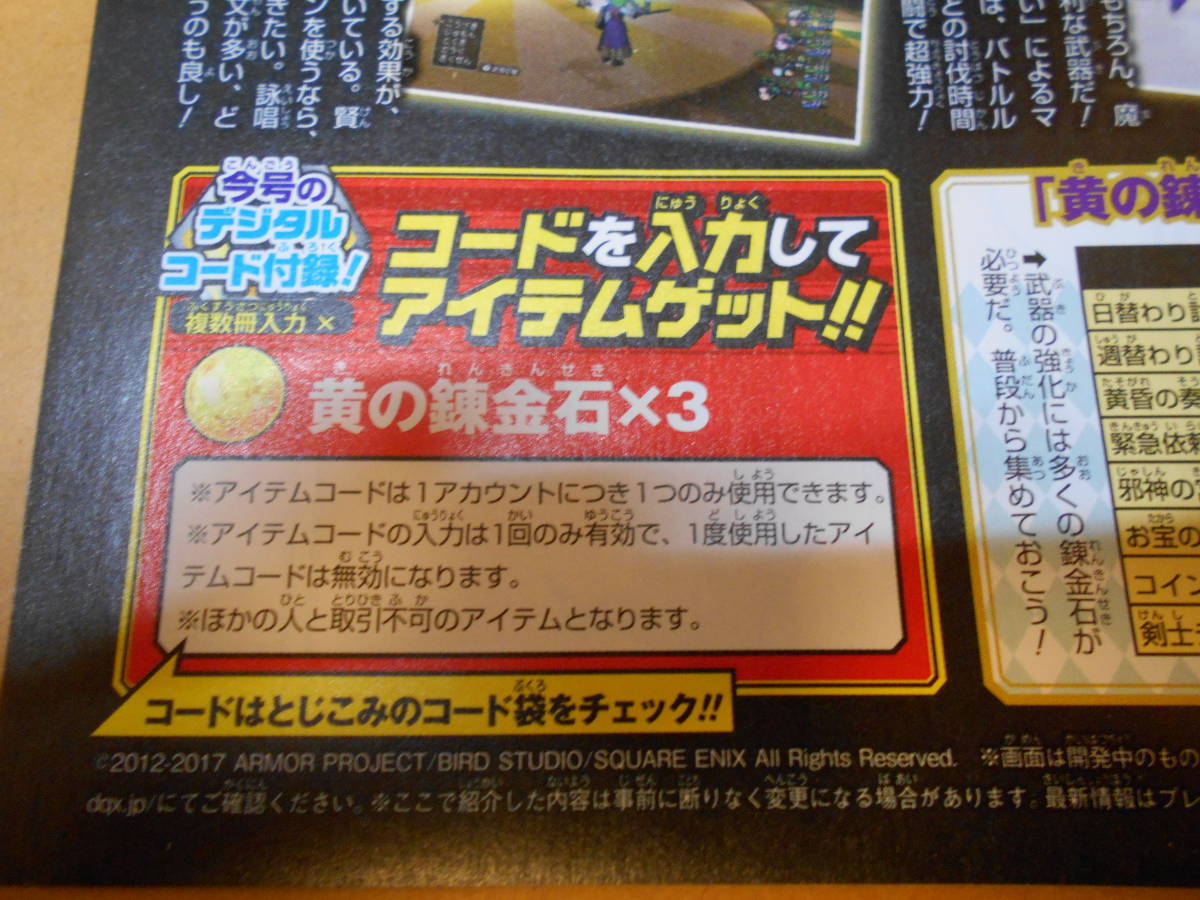 - ドラゴンクエストX オンライン アイテム デジタル コード 黄の錬金石 ×3 ふろく Vジャンプ 2017年6月特大号 付録 ドラクエ10