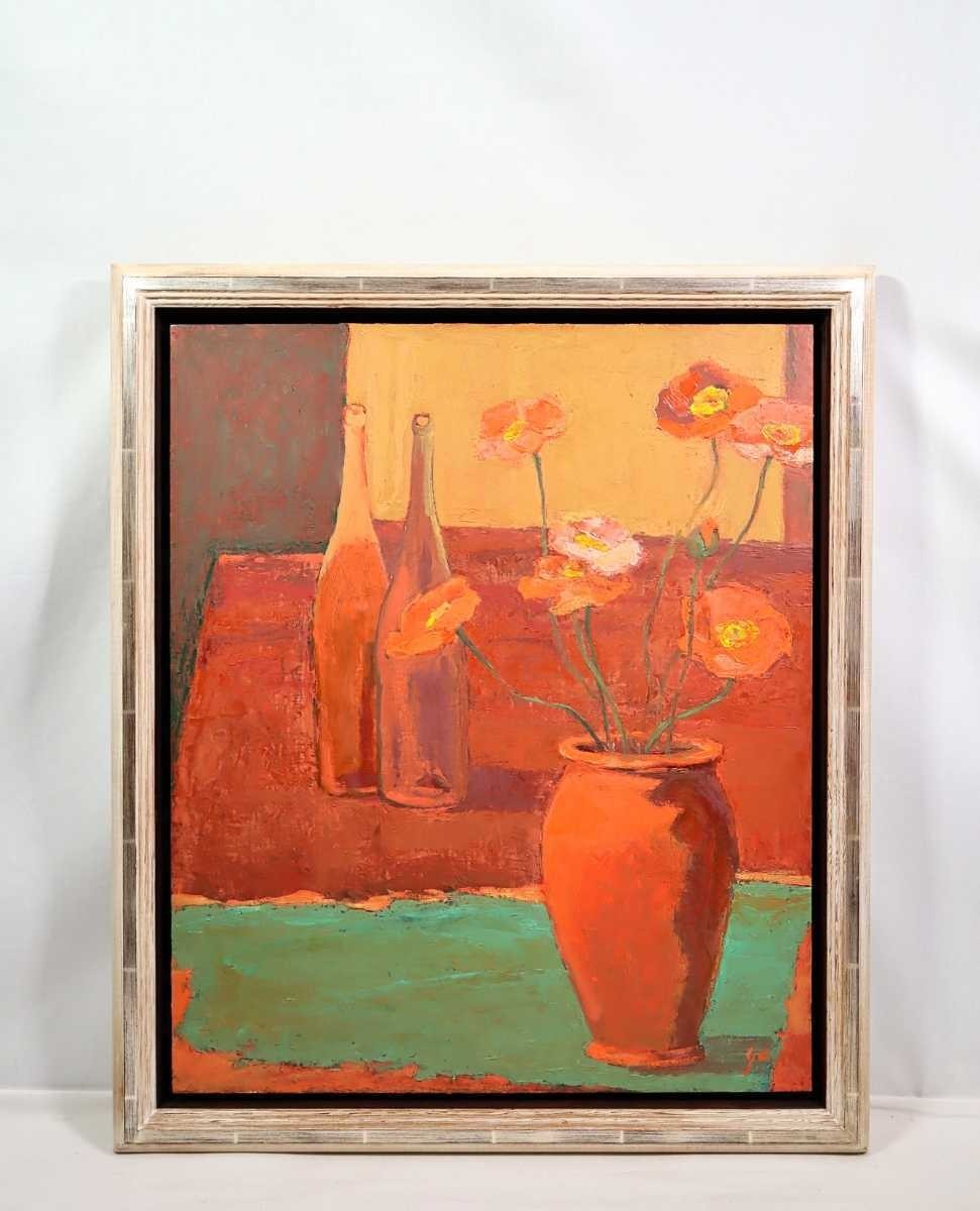 - 真作 板倉よう 1996年傑作油彩「春の花」画寸 F20 東京都出身 立軌会会員 好んでよく使う濃いオレンジ色を基調に落ち着いた雰囲気 5939