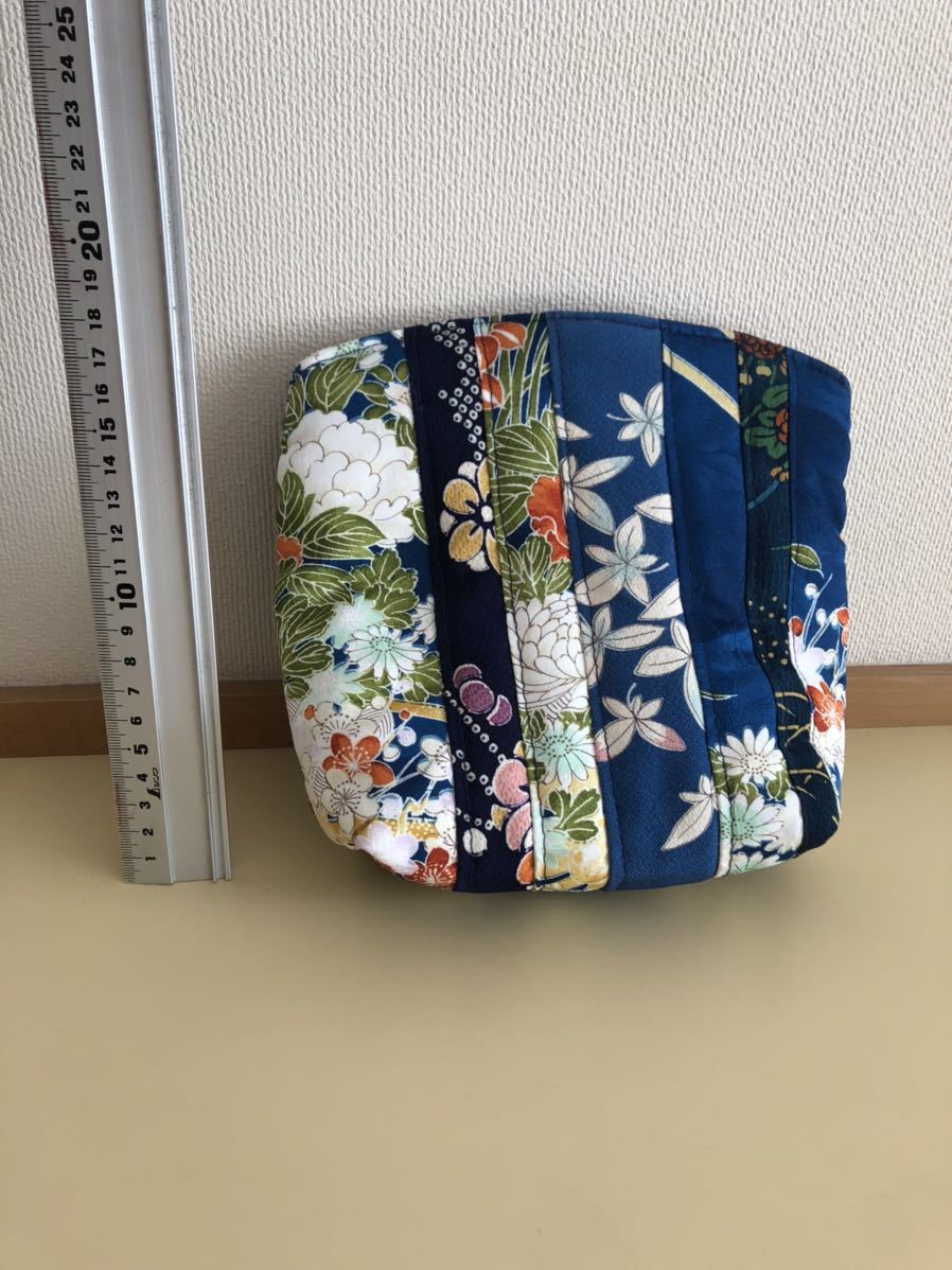 - ポーチ 着物地 着物リメイク パッチワーク 青系 正絹 玉ファスナー
