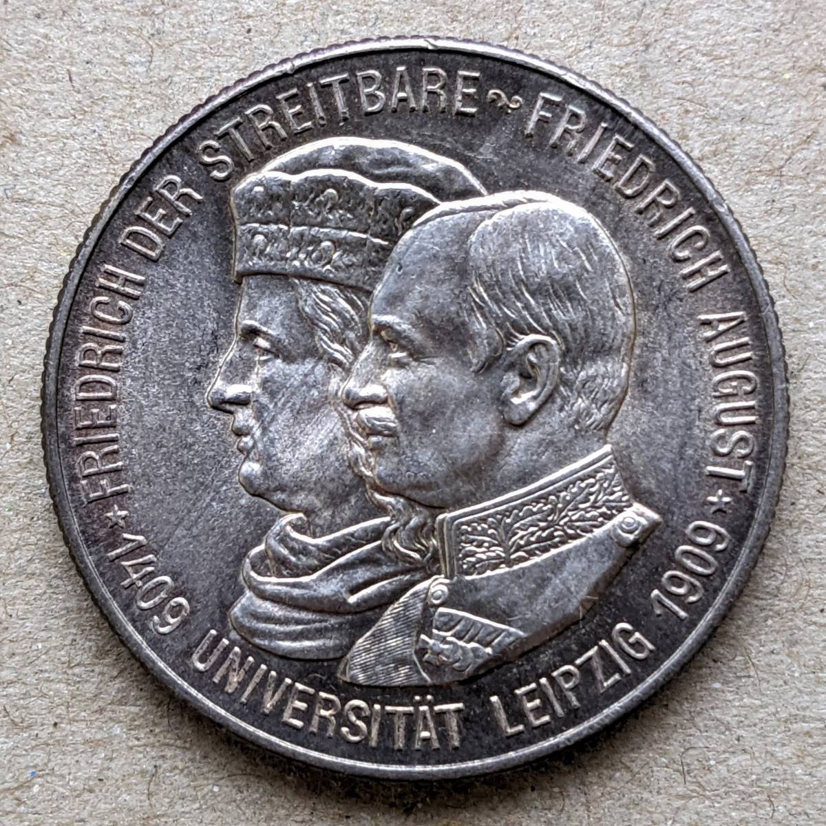 - 1909年 ドイツ ザクセン フリードリッヒアウグスト3世 ライプツィヒ大学創立500周年記念 2マルク 銀貨 UNC ライプチヒ