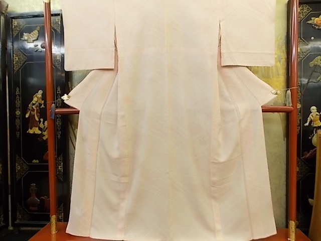 > きもの今昔4499 単衣の小紋のきもの 正絹一越地アイボリー地に網目模様 もみじの隠れ模様入り 身丈154cm
