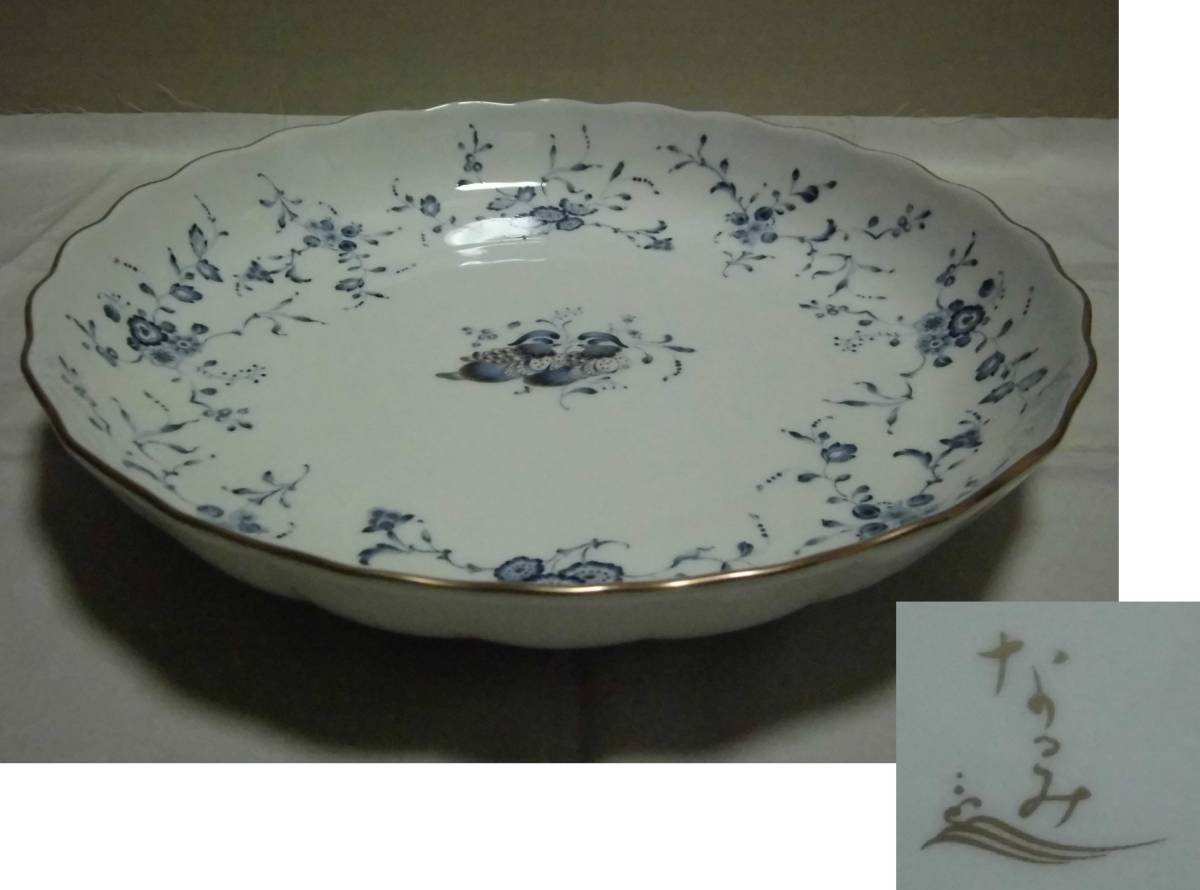 > 大皿 なるみ 染付 金彩 NARUMI ナルミ 鳴海 花柄 盛皿 盛鉢 30.3cm 大鉢 花鳥 陶器 食器 工芸品 レトロ