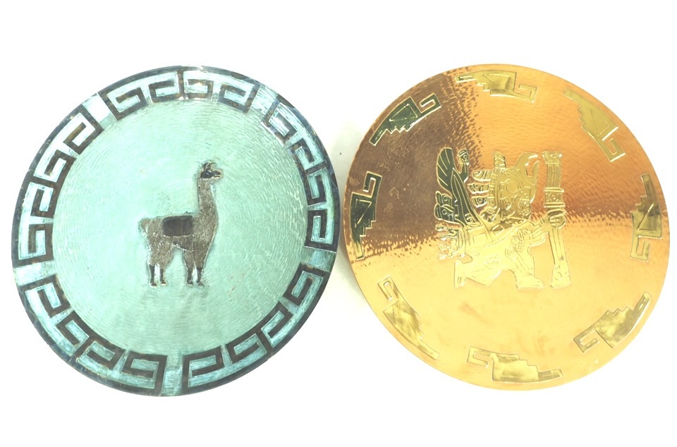 > 南米産 ビンテージ Vicky ビッキー銅製ハンドハンマー加工 装飾プレート インカ神紋・アルパカ紋 2セット 壁掛け ウォールアート KYA412