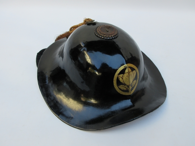 - 時代■大名家紋入り陣笠 黒漆塗 家紋陣笠 [丸に橘] 内朱塗 顎紐付■ 天然木 武具 骨董 古美術 №8563■