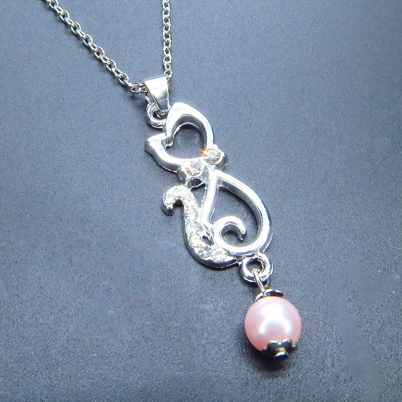 - ラインストーンが輝くシルバーカラーの猫モチーフとスワロフスキーパール(ロザリン)の可愛いペンダントネックレス