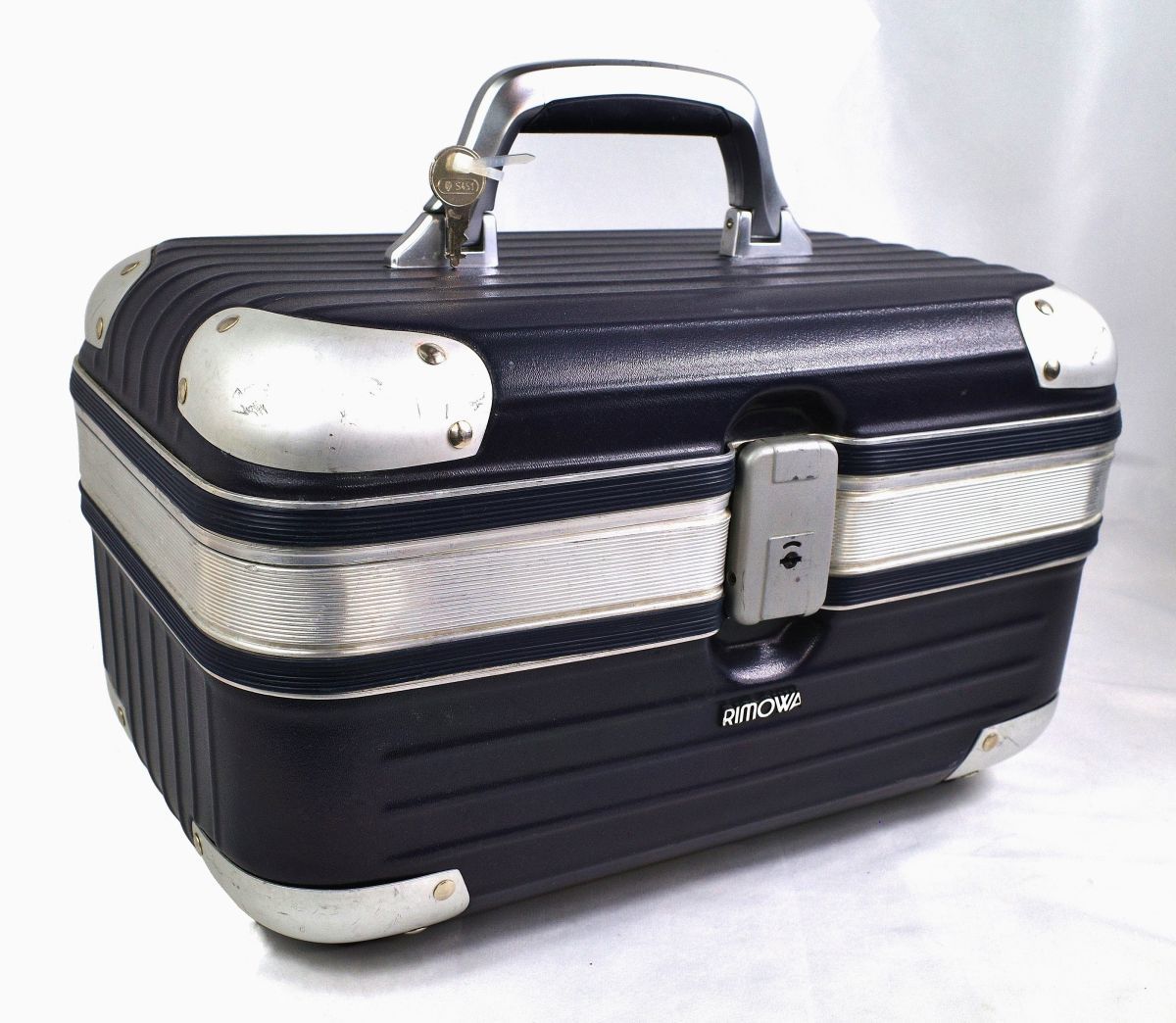 ■RIMOWA リンボ の814.38、ビューティーケースのナイトブルー、19Lです。 ビンテージです。 もちろん機内や車内への持ち込み可能サイズで貴金属・こわれもの・貴重品・精密機械 などの運搬にも使えるケースです。 カメラケース、簡易金庫、道具箱、裁縫箱、救急 箱、非常持ち出し函などとしてスマートに身近に置けるRIMOWAです。人に見られた くないものを収めるのに適したターンキィ付きラッチはSUDHAUS製です。