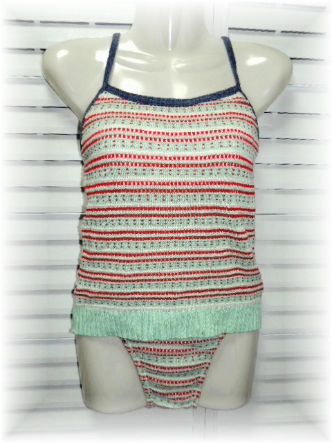 - トータスイレブン 日本製 ニットタンキニ セパレート水着 9号/M ライトミントグリーン×レッド