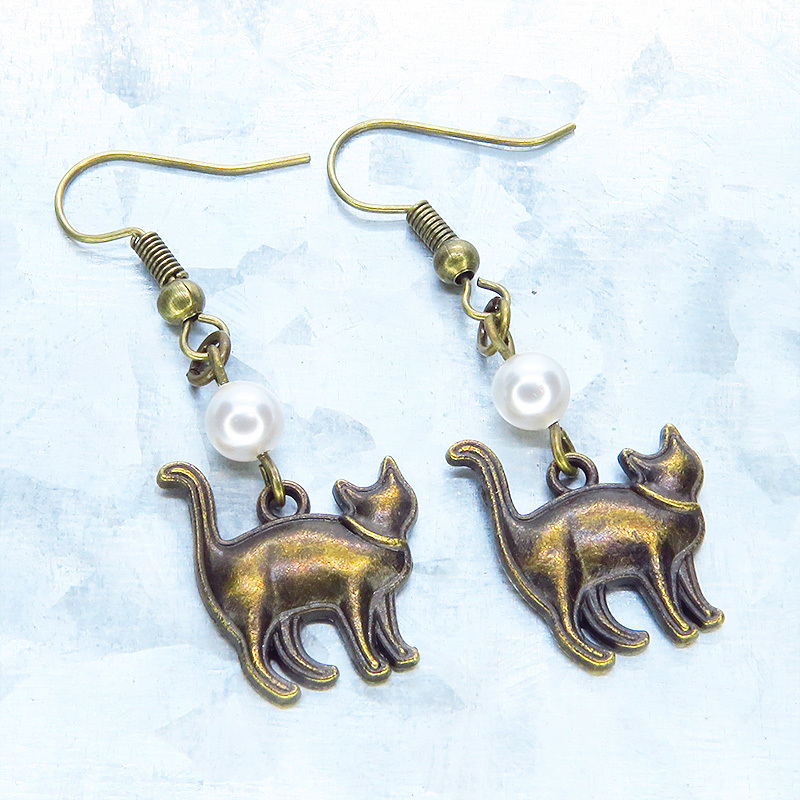 - アンティークゴールド 歩き猫シルエットモチーフとスワロフスキーパール(クリスタルホワイト)のピアス