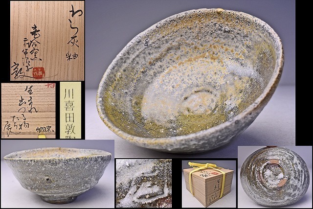 > 川喜田半泥子 2代 ( 川喜田敦 )★ わら灰釉 茶碗 ★ 共箱 栞 ★ 生まれ出つる物たち展 出展作 銘:『 古希の春 』★ 景色抜群の逸品 ★