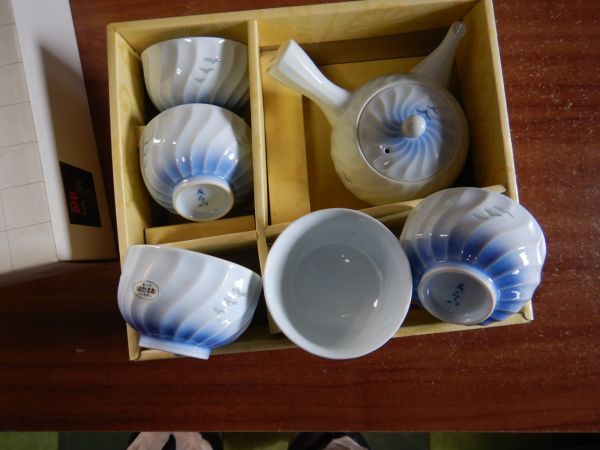 - 032016 有田 お茶器 青吹き 湯呑 湯のみ お茶 急須セット ほたる彫り 8.5H5CM 5セット 日本製 未使用