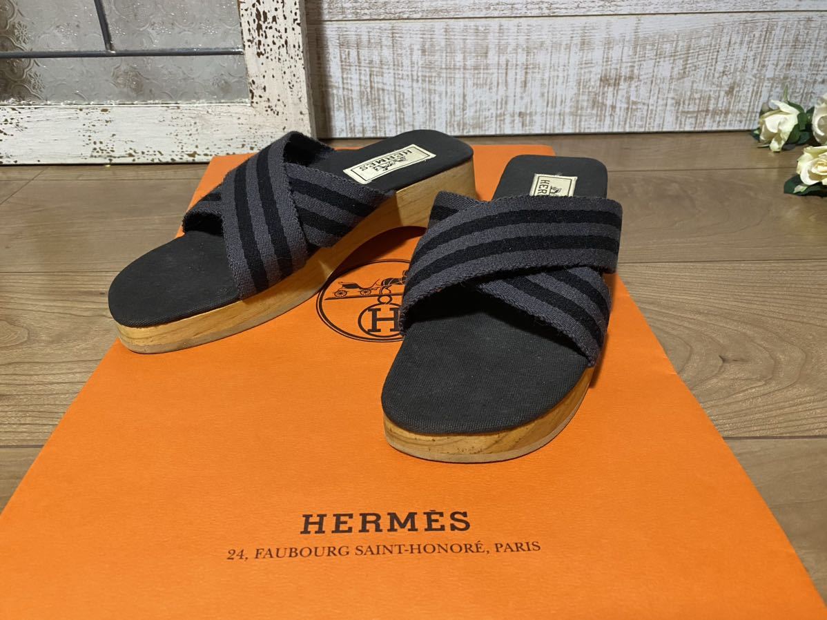 - 超美品☆カッコいい♪☆HERMESエルメスフールトゥウッドソールサボサンダル37木製厚底サンダル24cmブラック&グレー本物格安