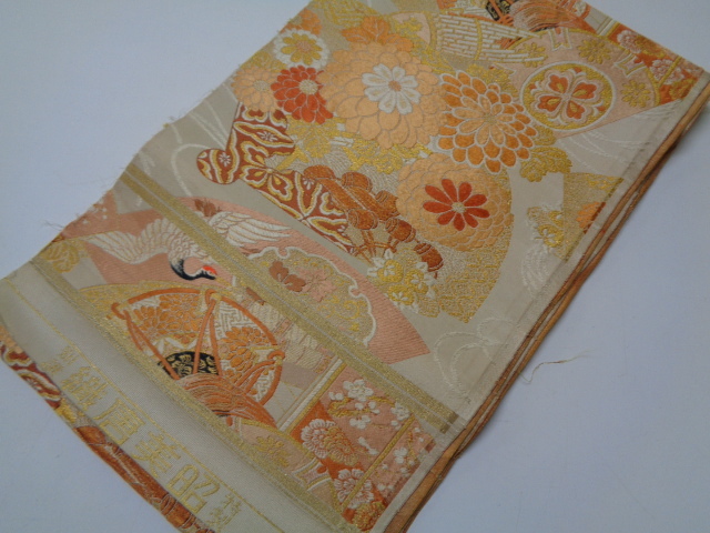 - c445-80 袋帯ほどき 唐織 金糸 吉祥菊水車鶴扇鼓笙文 長さ約4メートル リメイク素材