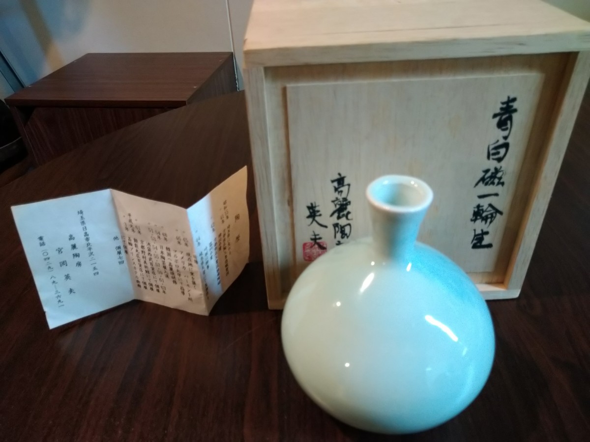 > 未使用 保管品 高麗陶房 宮岡 英夫 青白磁 一輪生け 花器 生け花 茶道具 共箱&陶歴書付き 高さ約13cm 横幅約10cm 個展購入