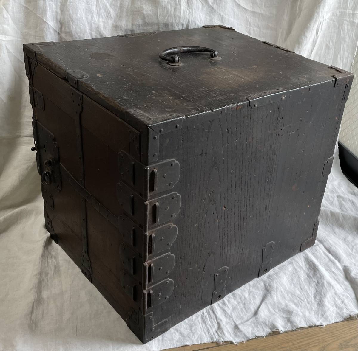 - 旧家より時代物 木製 持ち手付 船金庫/船箪笥 時代金具 鍵無し 小引き出し 六杯 和箪笥 帳場箪笥 鉄製金具 銭函