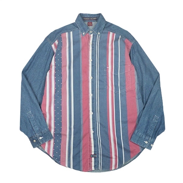 - 送料無料 80s 90s FADED GLORY ビンテージ オールド デニム ドット ランダム ストライプ デザイン シャツ コットン アメリカ 古着 長袖