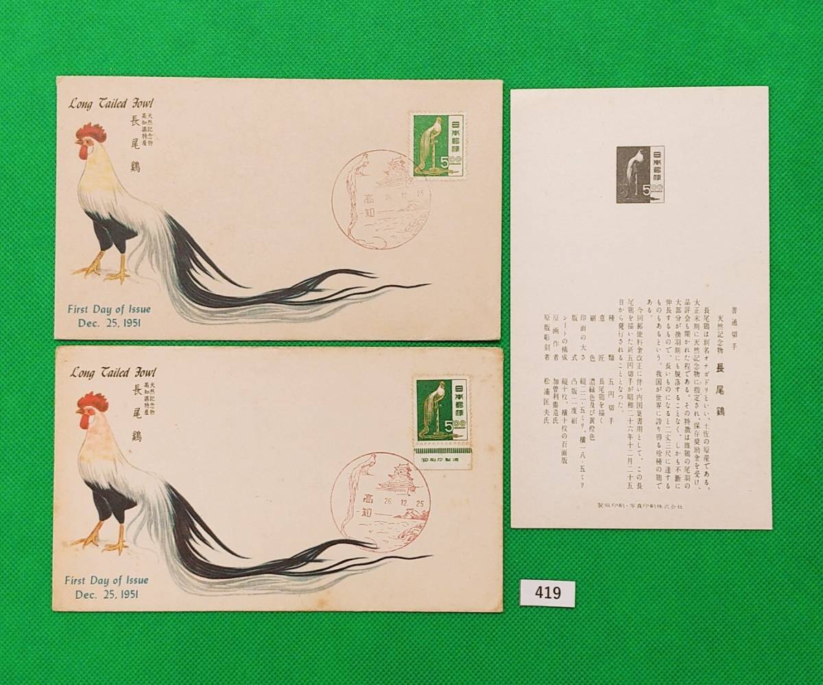 > FDC/ア/昭和すかしなし/尾長どり/激レア/濃色淡色2種セット/初日印/高知風景印/解説書1枚有り/1951年12月25日/初日カバー №419
