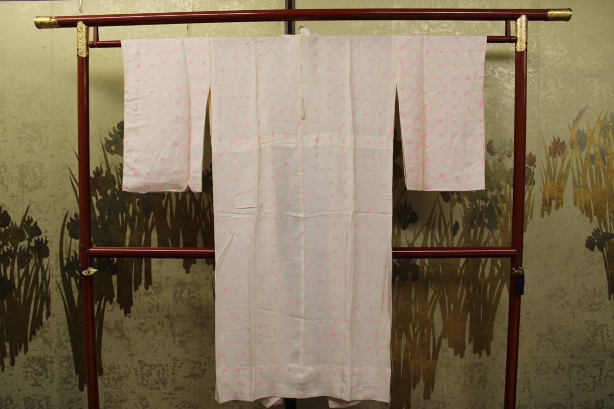 > きもの今昔5081 長襦袢 正絹綸子地麻の葉型絞り 広衿袖無双身頃単衣仕立て 白地ピンク柄 身丈120cm