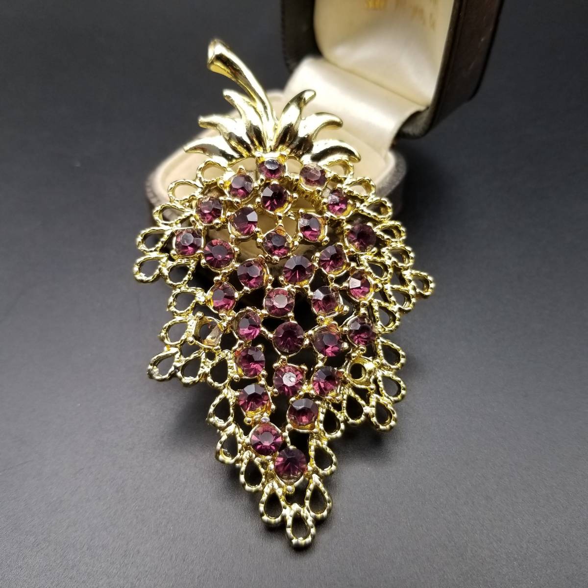 > パープル カットガラス 葡萄 植物 モチーフ ヴィンテージ ブローチ 昭和レトロ コスチュームジュエリー フローラルデザイン 紫 YAH④