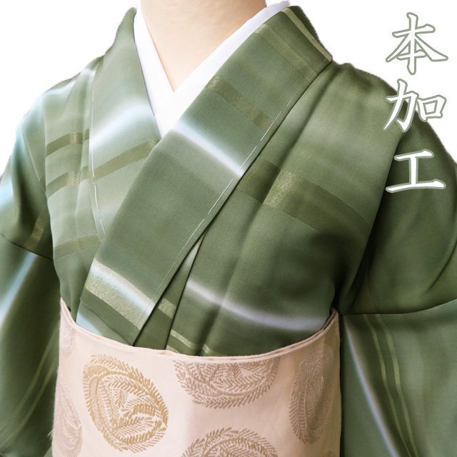 > 特選 訪問着 着物 中古 正絹 袷 フォーマル 本加工 ぼかし染め 暈し 横段模様 黄海松茶色 金 身丈160cm 裄64cm M きもの北條 A866-6