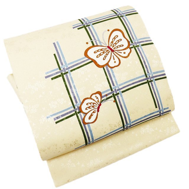 - 名古屋帯 中古 リサイクル 正絹 カジュアル 仕立て上がり お太鼓柄 蝶の図 練色 きもの北條 A849-12