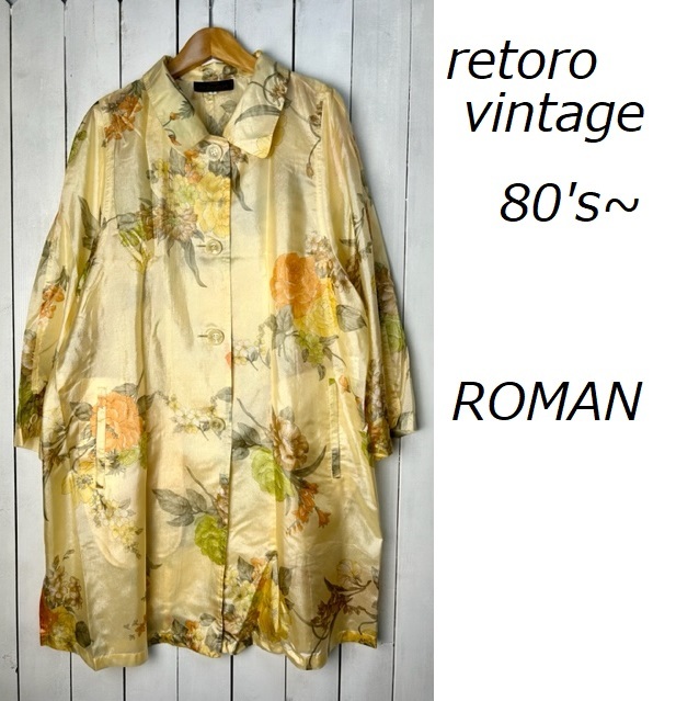 > sh●495 国産レトロ古着 80s~ 極薄手 花柄ペーパーシャツコート 羽織り 9 M~L ROMAN オールド ヴィンテージ 長袖 春夏 日本製