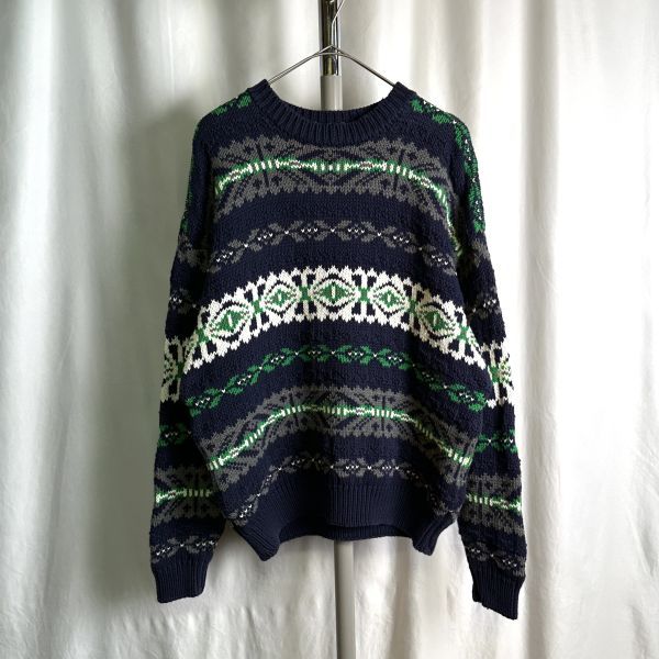 > アイルランド製 90s OLD GAP 総柄 ボーダー コットン セーター M ネイビー ニット ワイド オールド ギャップ 80s 00s 古着 ビンテージ