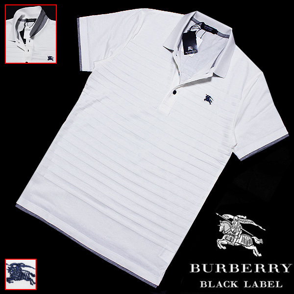 - 新品!2(M) バーバリーブラックレーベル 【日本製】立体シャドーボーダー×ホース刺繍 伸縮性 半袖ポロシャツ 白■BURBERRY BLACK LABEL