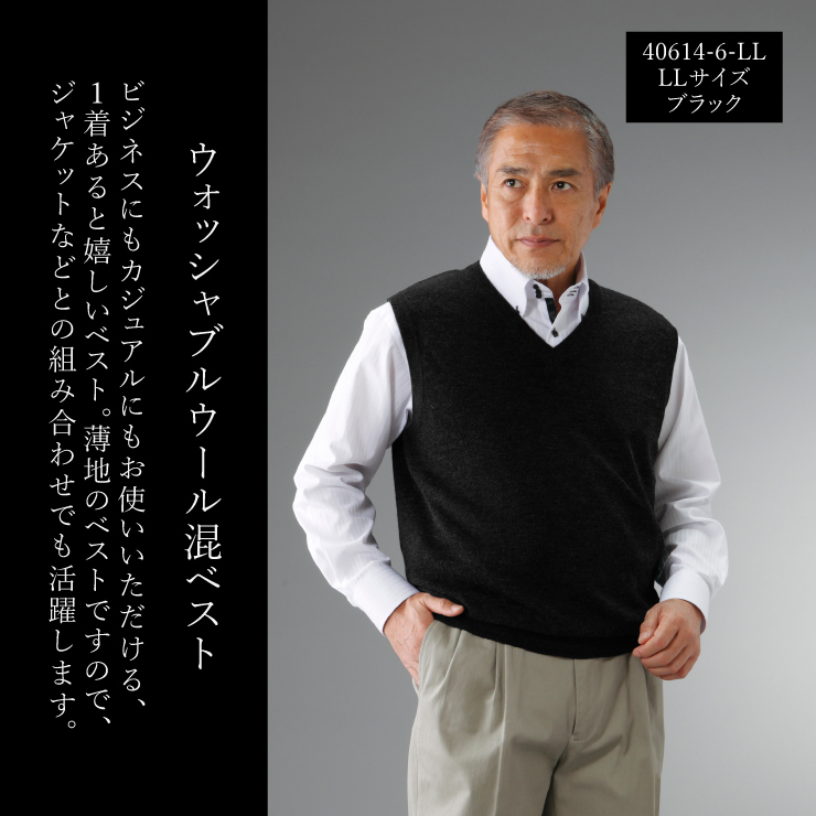 > 洗えるウール混ベスト LLサイズ ブラック●40614-6-LL●新品 薄手 薄地 メンズ 男性用 ウォッシャブル 毛 秋 冬 おしゃれ 通勤 仕事用 Z1
