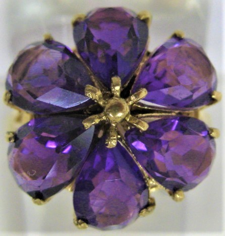 - 【東京 谷中 質屋おぢさん】K18 18金 リング指輪 アメシスト ペアーシェブ9mm×5.5mm 6ヶ花柄
