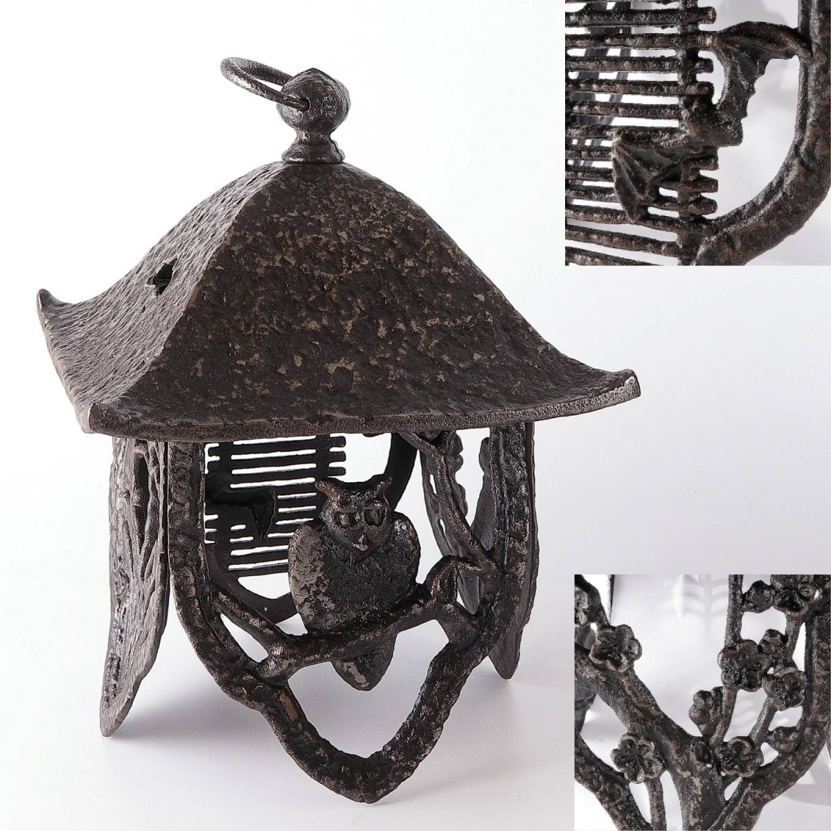 - ◆◇時代 鉄製草花梟蝙蝠透文吊灯籠 鉄燈篭 灯篭 重量5.1kg■ふくろう コウモリ フクロウ 照明 古道具 骨董古美術 アンティーク◇◆