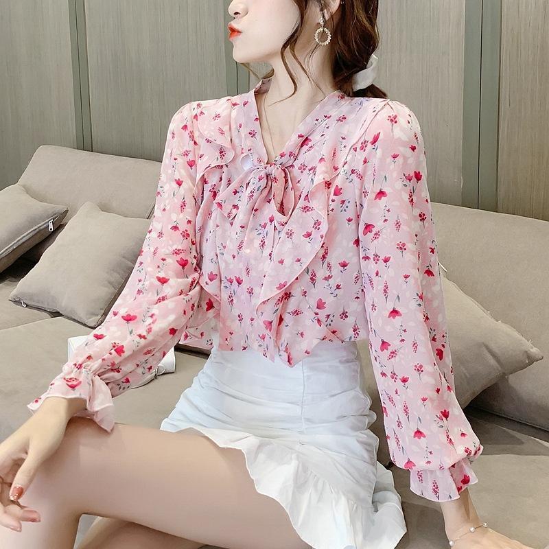 - 【ピンク★L】レディースリボン ブラウス シャツ 長袖