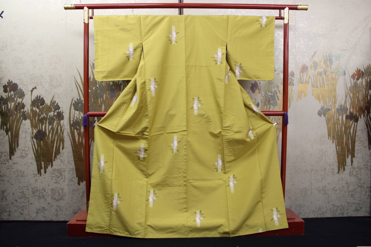 > きもの今昔5548 紬のきもの 十日町紬 からし色地椿花木の絣柄 シツケ糸付き使用品 問題なく美しい 身丈166cm