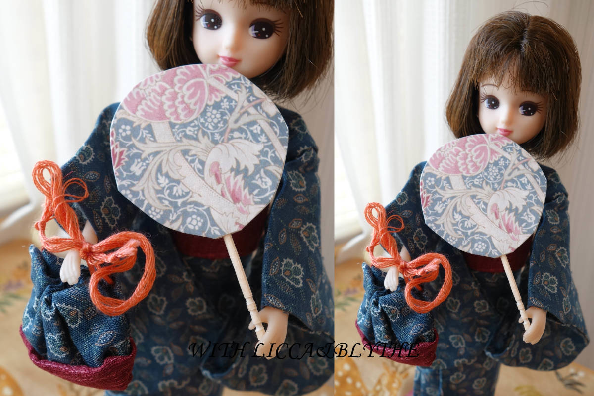 - 紺生地の浴衣着物と帯・うちわのセット♪(ブライスにも)
