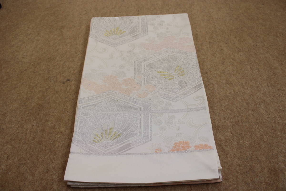 > きもの今昔5666 袋帯 ポリエステル製 白地緞子織地銀糸亀甲に揚羽蝶 背景には唐草と小花文様 新品未仕立て品