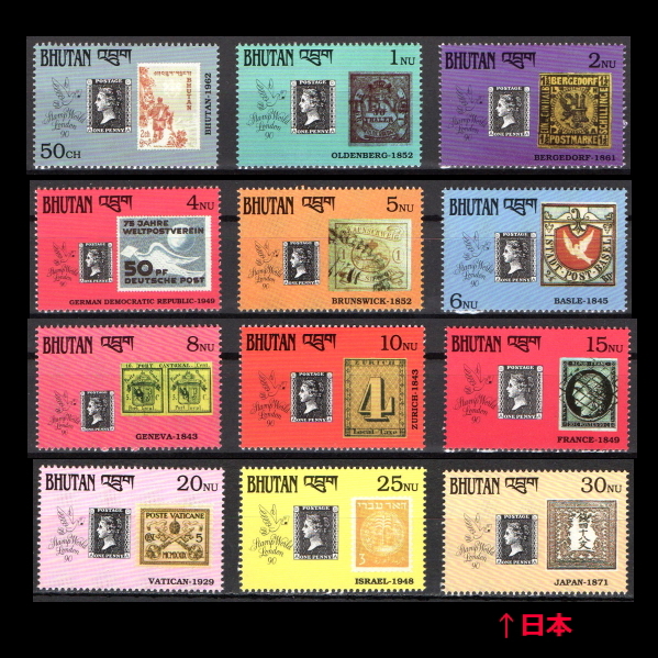 - ■ブータン切手 1990年 ロンドン国際切手展 / ペニーブラック150周年 12種完