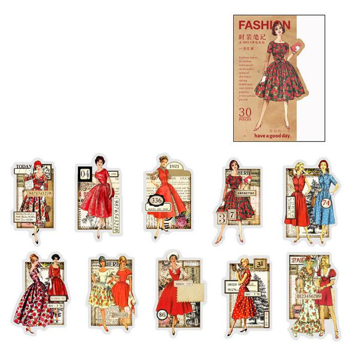 - 30枚 シール 女性 女の子 ファッション ドレス アンティーク ビンテージ デコステッカー アンティーク調 コラージュ レトロ 0783-1