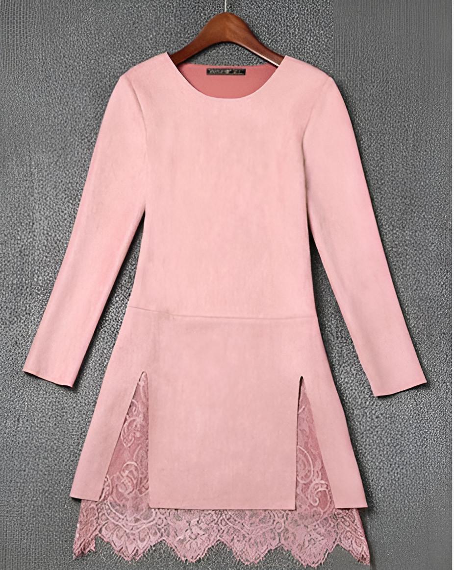 - 42-2.パーティードレス スリット ワンピ ミニ丈 長袖 裾レース ピンク L