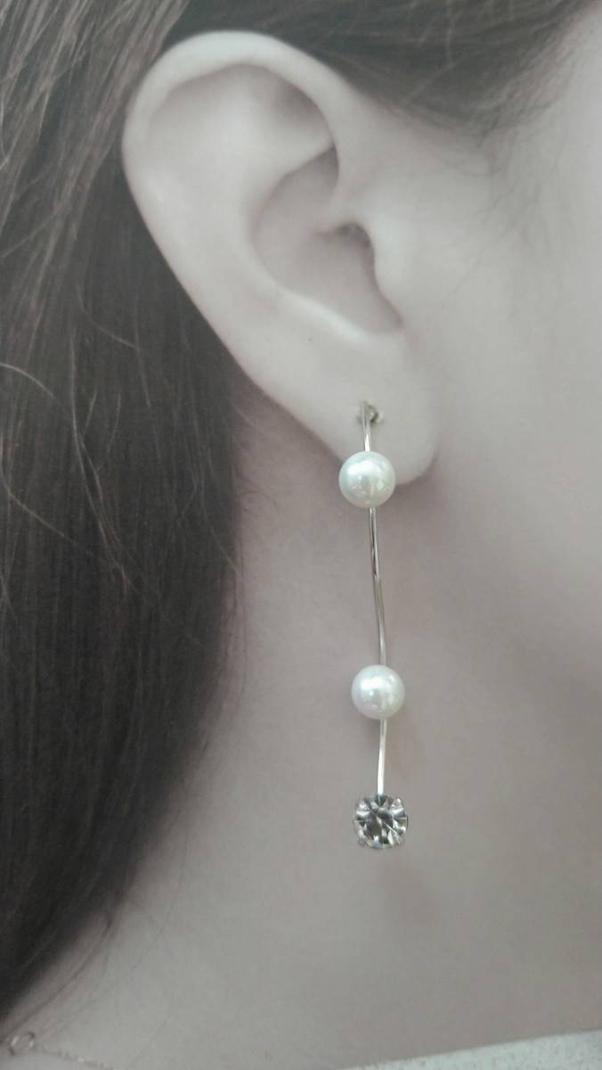 - 涼し気な印象 シルバーカラー湾曲・バー×パールビーズ×ラインストーン ピアス