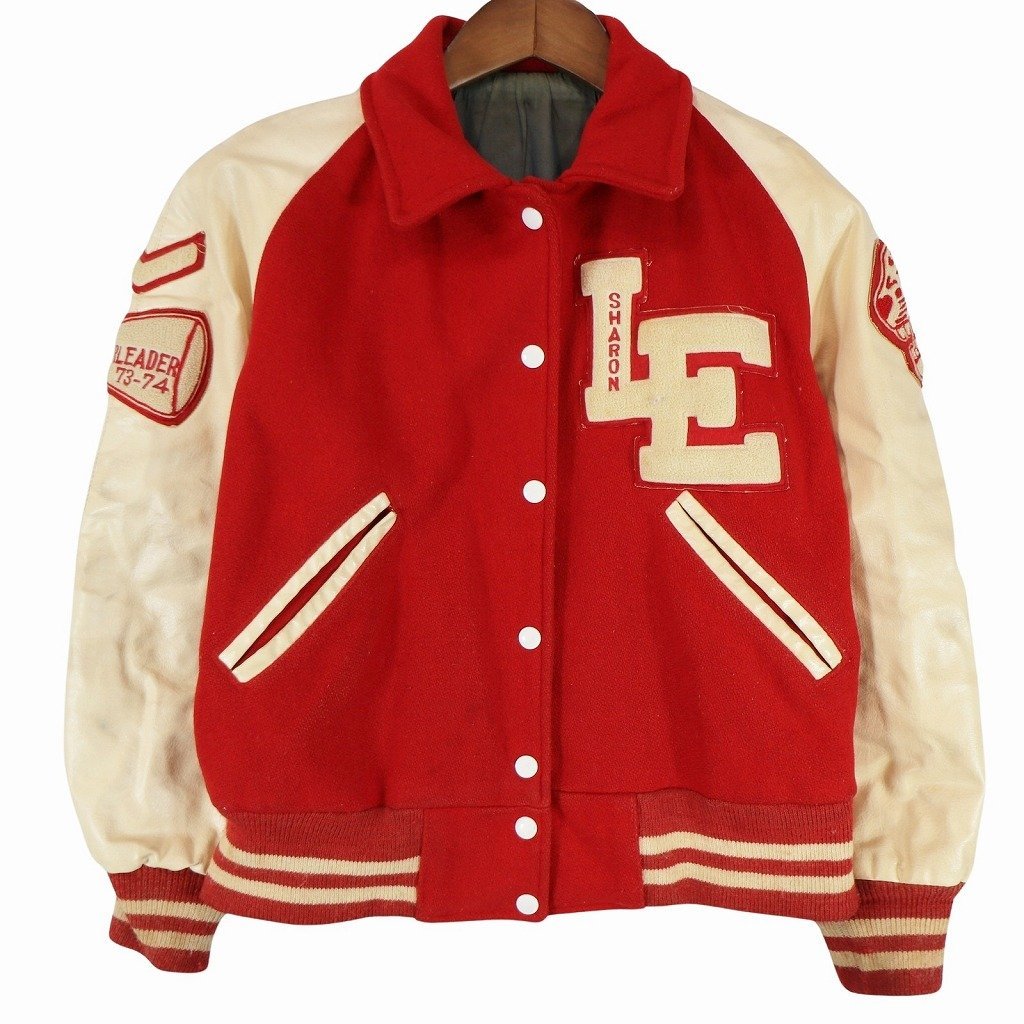 - 70年代 UNKNOWN スタジャン スタジアムジャケット ワッペン チアリーダー レッド (レディース L相当) 中古 古着 O4546