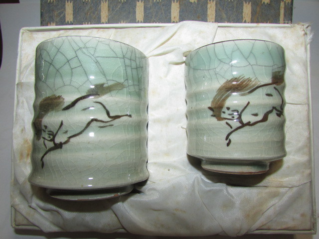 > ( 会津若松・旧家・蔵出し)相馬印有り・昭和レトロ(古い味わいのある大堀相馬焼・駒絵青磁夫婦茶碗 )未使用・貴重・珍品
