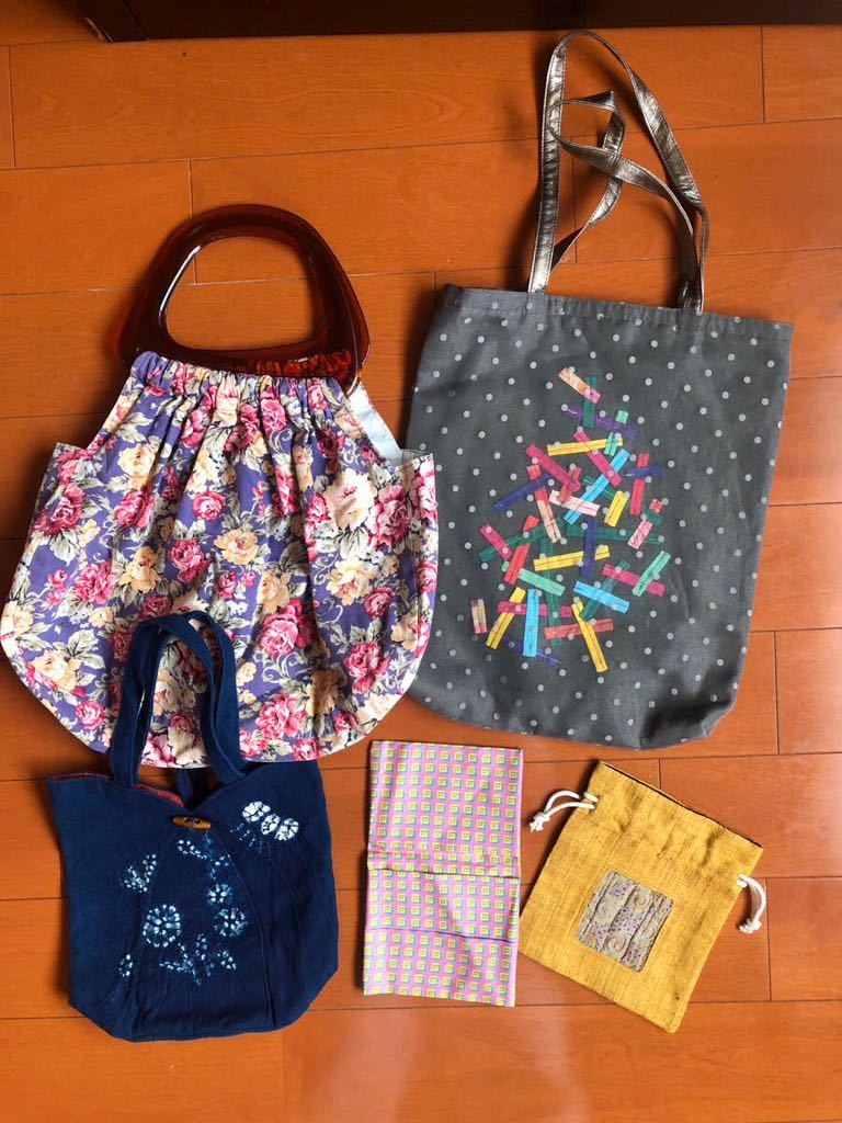 - 5点まとめ売り!布製トートバッグハンドバッグA4対応&ティッシュケースポーチ&巾着袋♪グレー藍染ネイビー花柄辛子色和柄