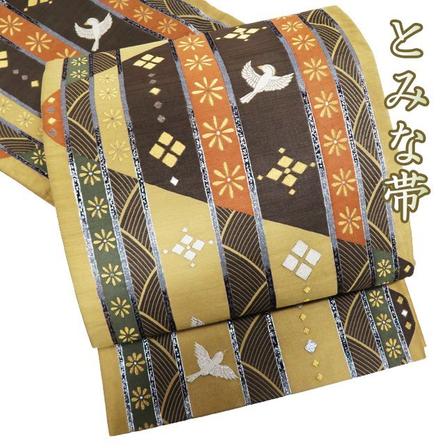 - 特選 袋帯 中古 リサイクル 正絹 フォーマル 仕立て上がり 六通 西陣 となみ帯 縦段模様 鳥 箔糸 茶系色 多色 金銀 きもの北條 A938-13