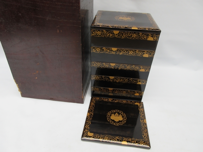 > 重箱 ■ 金縁黒漆塗 内朱塗 唐草蒔絵[ 家紋 桐紋 ] 5段重箱 替蓋 ■ 天然木 時代漆器 古道具 塗木箱入り №9223■