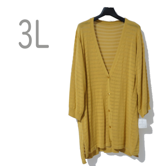 - ●新品/Vネック/チュニック/カーディガン/マスタード系/3L/ボーダー/レディース●f9782