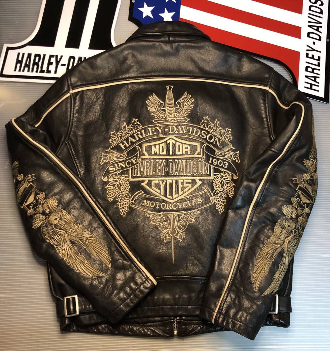 > 【稀少!金糸刺繍!限定品!】山羊ゴートスキン&牛革カウハイド・レザー※美品※ハーレーダビッドソン★ライダース ジャケット 革ジャン