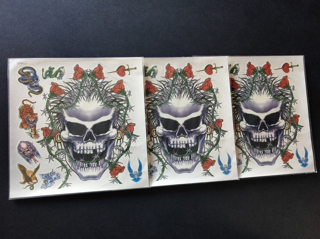 - スカル 骸骨 ドクロ タトゥーシール 未使用 3p !! ☆ 20.5㎝×21㎝ Body Art Skull Skeleton Severed Head Monster 怪奇 生首 ガイコツ 虎